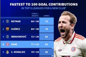 体育资讯3月30日讯 拜仁在本轮德甲3-2险胜圣保利,凯恩传射建功。德转数据统计显示凯恩已经为拜仁直接参与100球,位列新世纪五大联赛新援第4快。