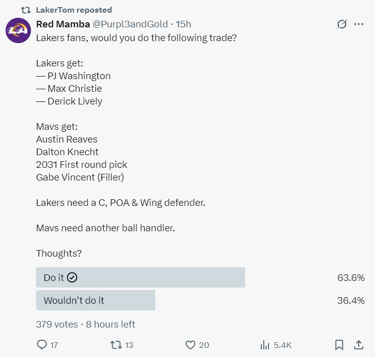 北京时间6月13日,湖人媒体RedMamba建议湖人与独行侠再度交易,他还询问了湖人球迷是否愿意跟独行侠做这笔交易。(来源也是约什-布哈所说佩林卡喜欢跟固定的伙伴进行交易)有63.6%的球迷觉得这笔交易可以做,有36.4%的球迷觉得不该做这笔交易。